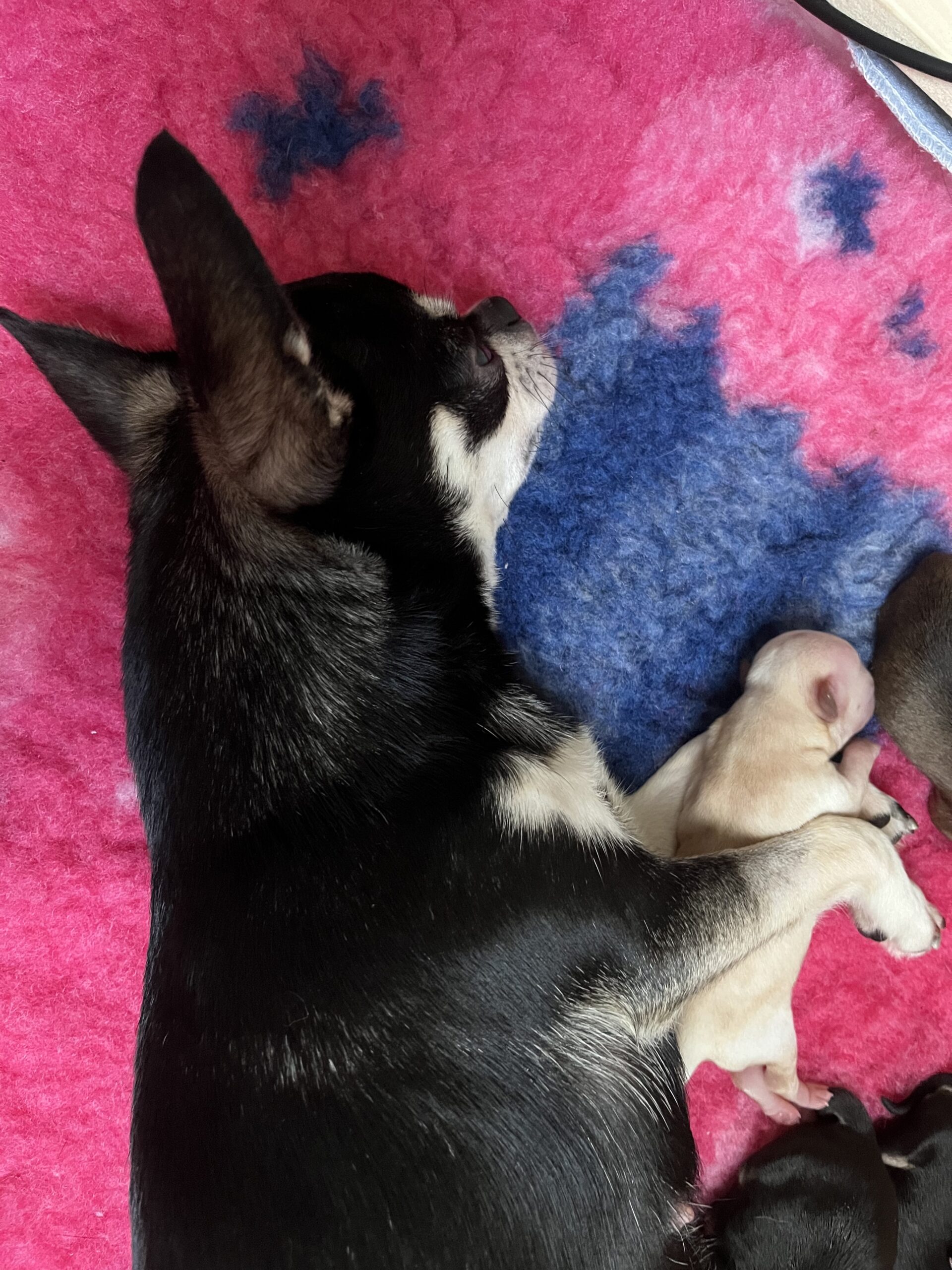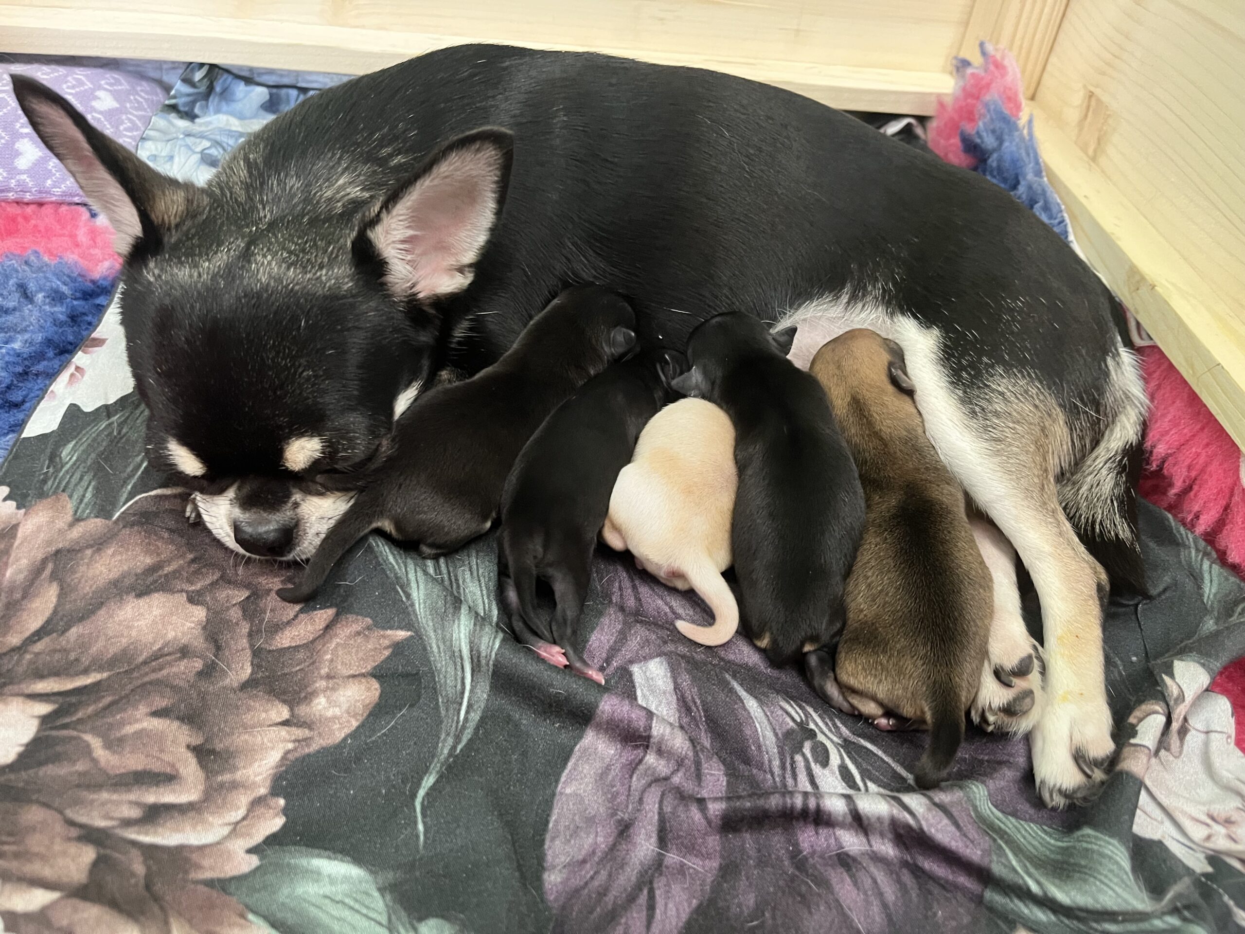 Štěňata: Černá s pálením, krémová a hnědá fenka, dva kluci černí s pálením