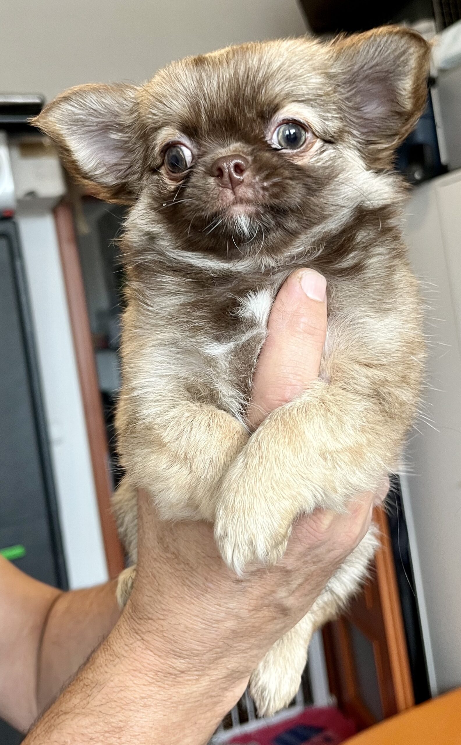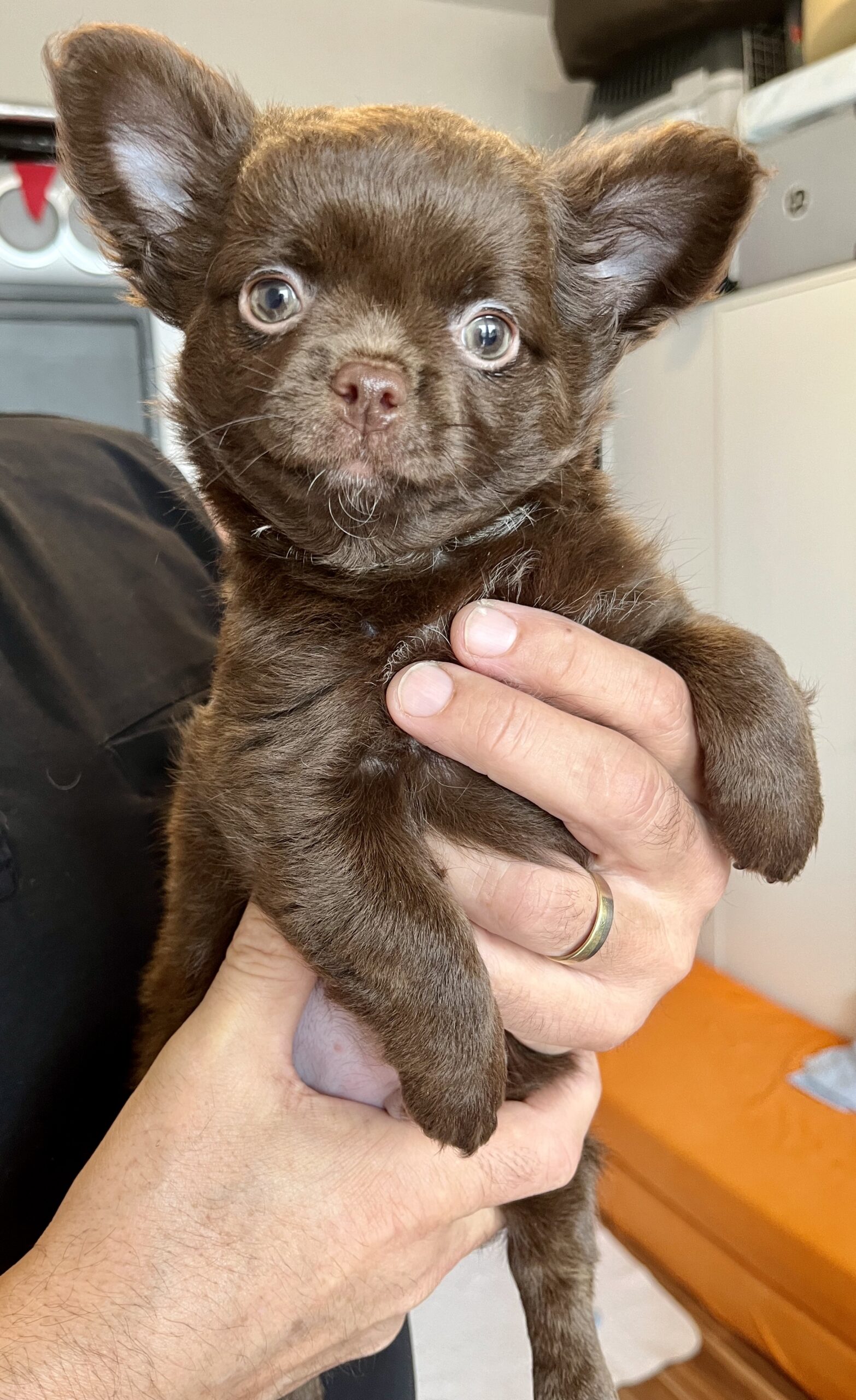 Štěňátka: Pes tmavě čokoládový s bílými znaky, fenky plavé